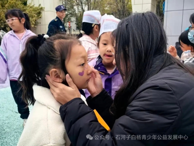 彩绘脸谱摊位前,志愿者老师们拿起水彩笔,为孩子们脸上涂上鲜艳的色彩,哪吒、小草莓、小樱桃、小猫咪渐渐成型,大家兴奋地向小伙伴“炫耀”:“你看我画的脸部彩绘,是不是超酷!”