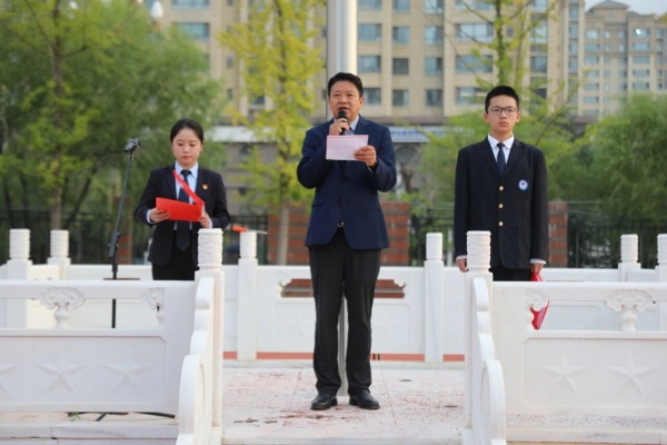 图为9月15日星期一全校师生举行升旗仪式,侯玉江副校长主持升旗仪式。