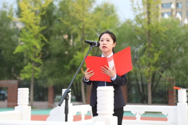 图为9月15日星期一全校师生举行升旗仪式,党员教师袁子婷老师演讲。