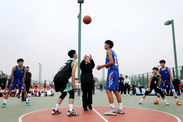 随后,裁判员代表与运动员代表先后上台宣誓,用铿锵誓言承诺遵守规则、尊重体育精神。在全场期待的目光中,大荔县教体局党委委员、副局长王文斌宣布“大荔县2025年秋季中小学生篮球赛开赛”,县教体局党委委员、副局长韩倩为赛事开球,清脆的哨声与欢呼声瞬间点燃全场氛围。