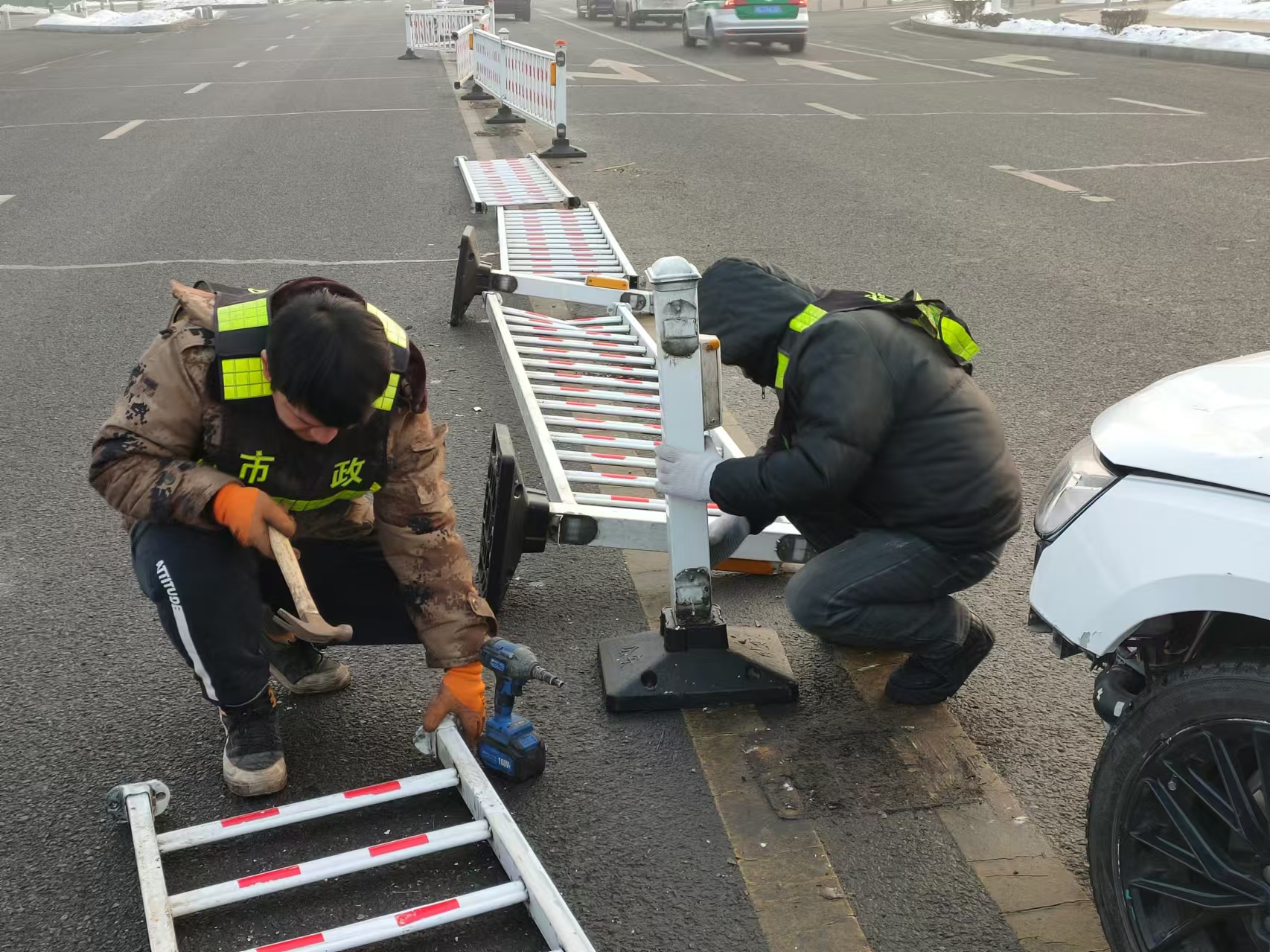 1月1日早上9点半,在北五路(东三路至东四路)职业技术学校向东100米处,石河子市城管局市政工程养护中心的交通设施维护人员正在紧急对