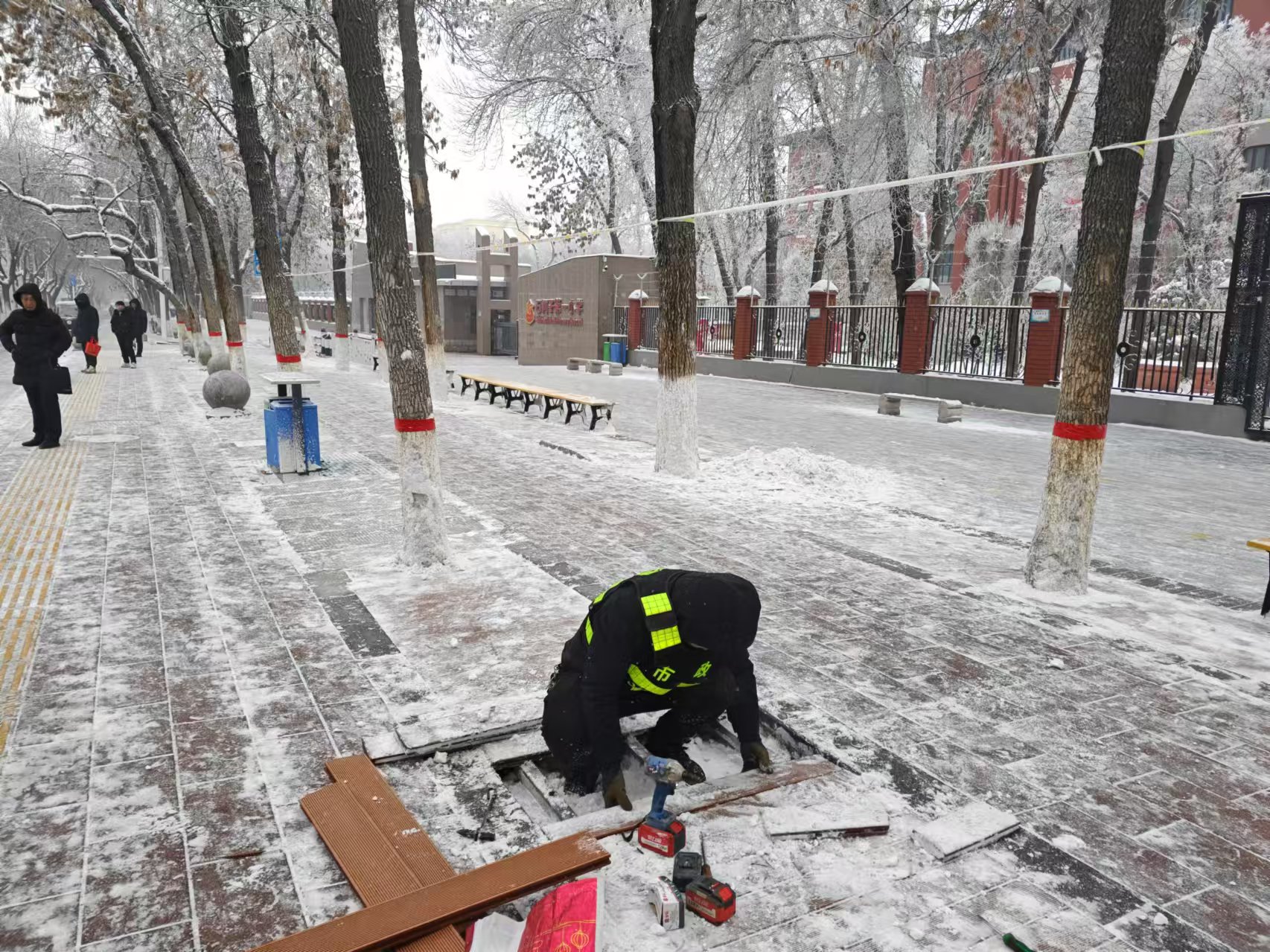 1月2日一大早,在我市北四路(西环路至西小路)石河子第一小学门前,石河子市城管局市政工程养护中心的市政设施维护人员正在对一处破