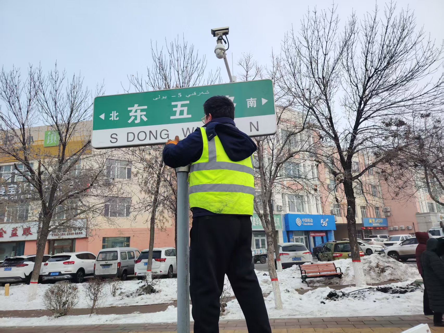 1月7日,在我市东三路上,经过城管局市政工程养护中心交通设施维护人员的校正紧固,原本歪斜松动的路名牌重新为这座军垦城市站好了军姿,在