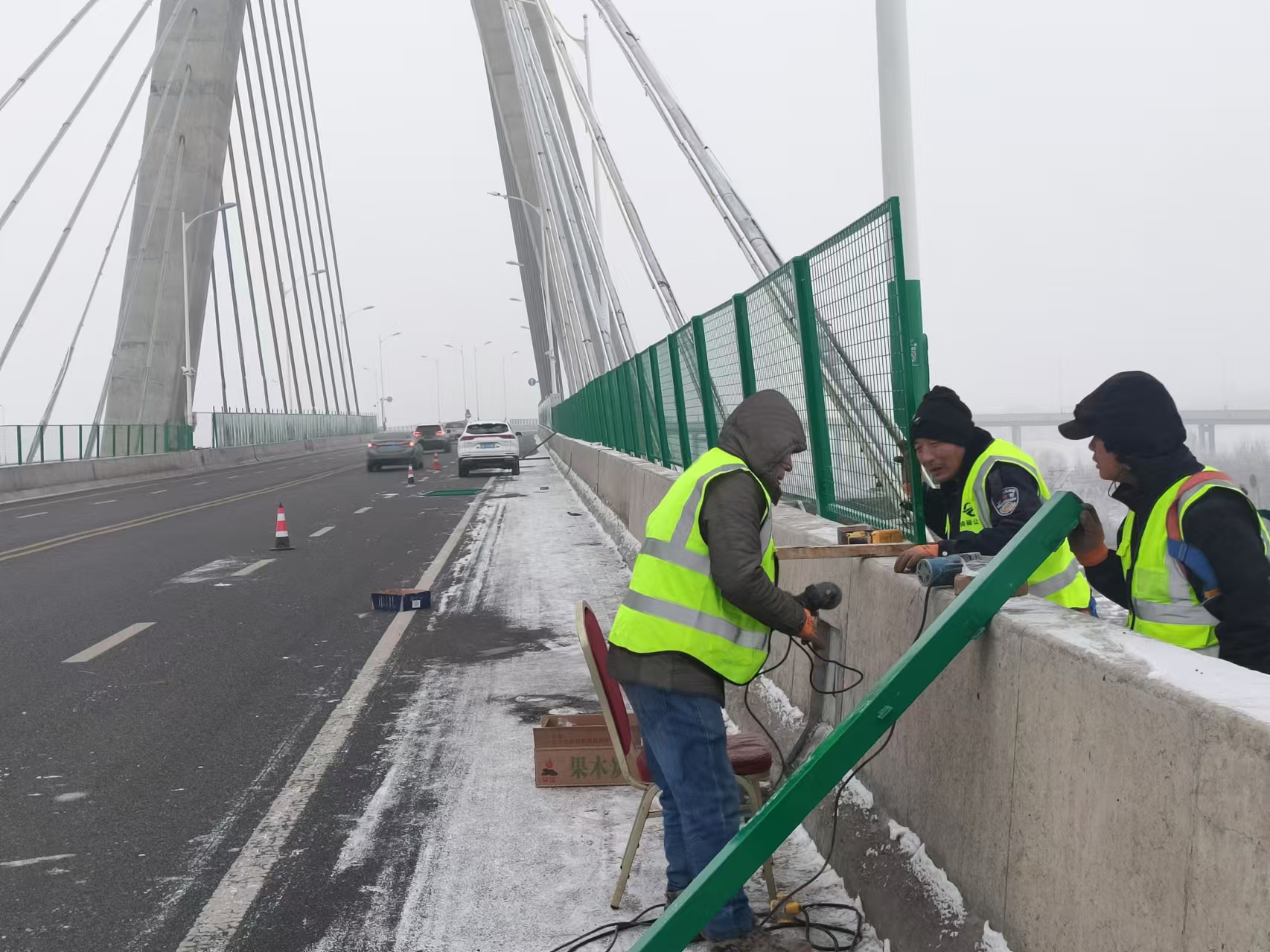 连日来,在石河子市西一路军垦一桥上,城管局市政工程养护中心的交通设施维护人员正忙着给主塔斜拉索桥两侧安装防抛网,在消除安全