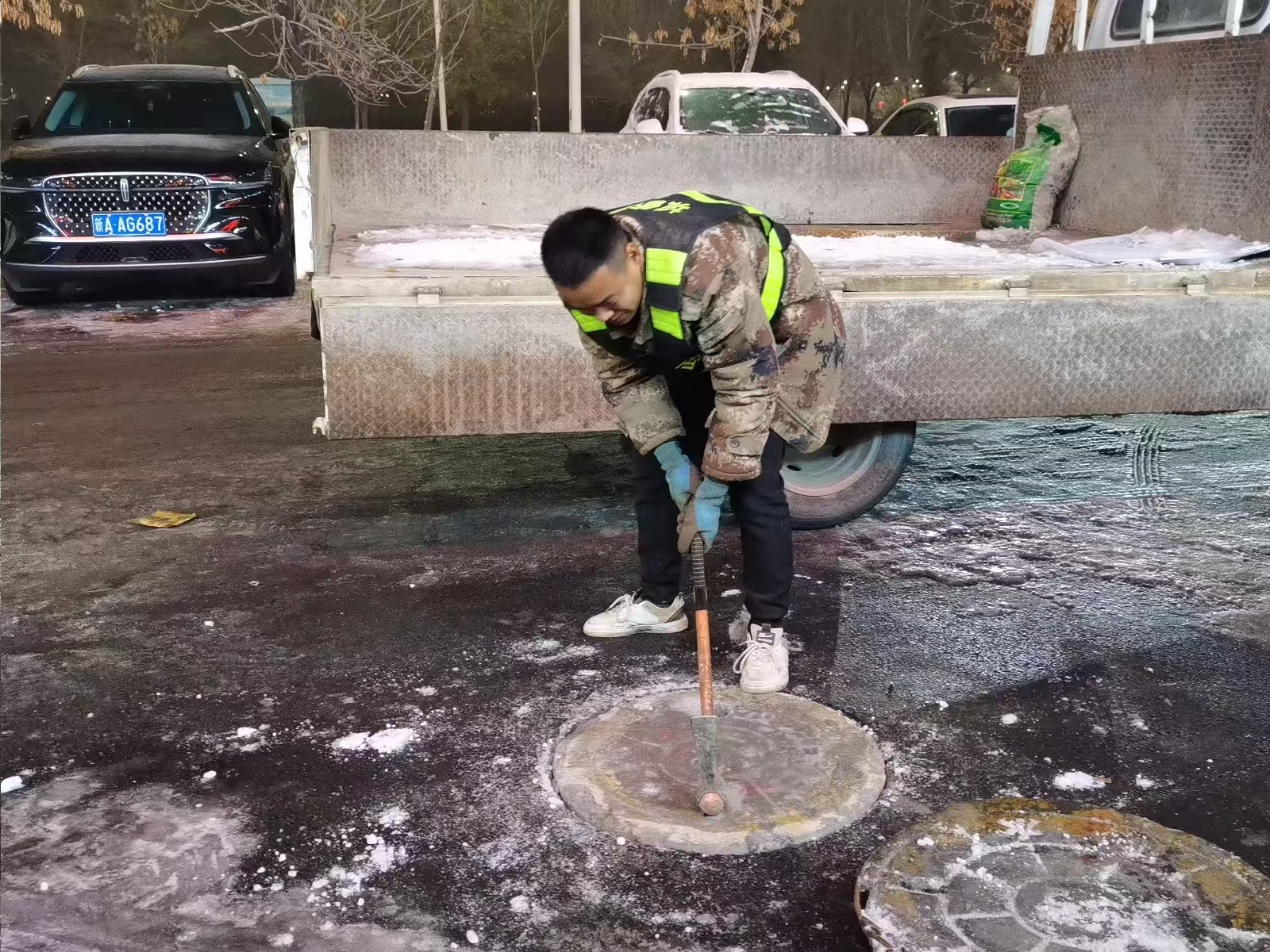 12月3日晚上9点,在北五路(东四路至东五路)48小区沿街门面前,石河子市城管局市政工程养护中心的维护人员正加班对破损的污水井盖进