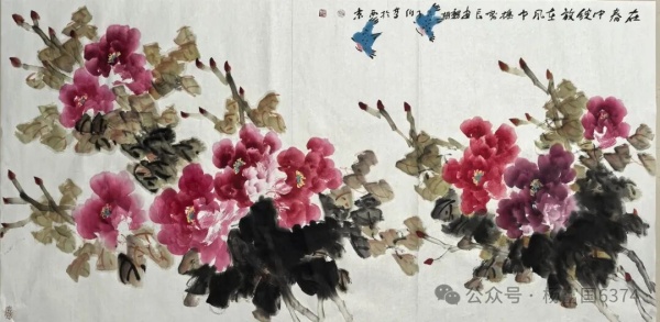 这奇妙多姿的风格,亦在其画面上逐渐绽放:一幅《在春中绽放,在风中摇曳》的牡丹图卷里,花团沉聚于下方与右端,红粉纷披层层叠掩,构成一种“密不透风”的热烈生命宣言。上方则天宇澄明,两只蓝色灵鸟轻灵滑过,那大片的“疏可跑马”处并非虚无,反而是气韵流动的呼吸之地,使整个画面似在无声处奏响了鬼斧神工般的春之序曲。