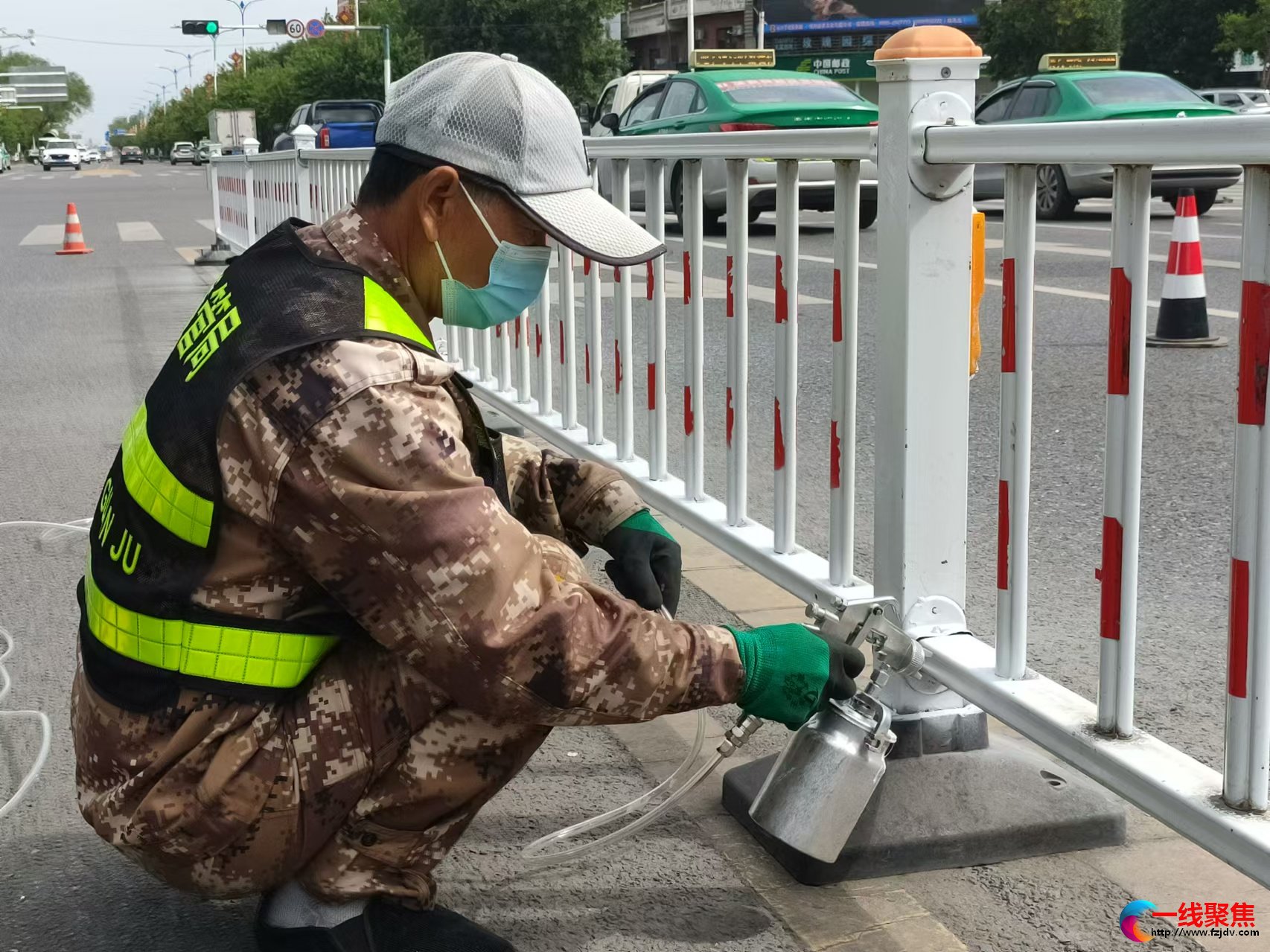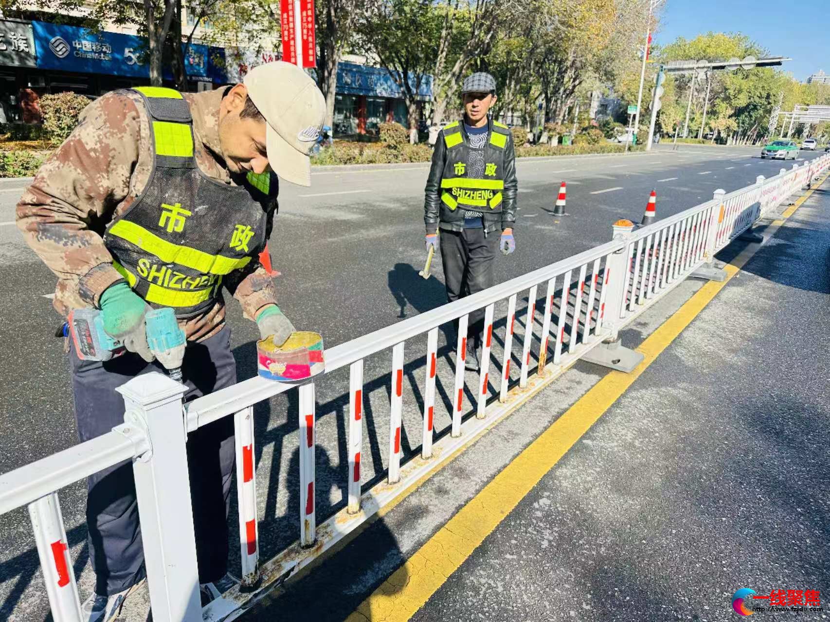 修复道路护栏、更换破损路名牌、施划斑马线、补划道路标线 国庆节期间,石河子市城管局市政工程养护中心交通设施维护工作忙不
