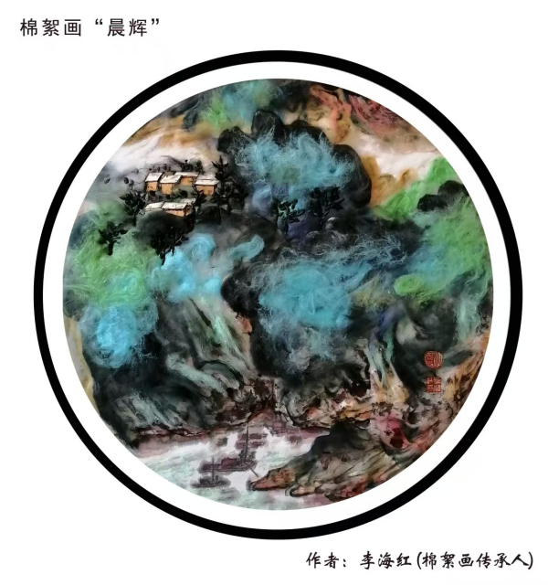 李海红老师多年来严谨的习作方式,早已熟稔棉絮画的各个步骤,在继承与创新的道路上不断探索着属于自己的创作途径。创作中不断结合现代审美,将油画、水彩、彩铅、水墨山水画的精髓和理念融入棉絮画中,在山水晕染的基础上添加洒金元素,古朴中又添新意。
